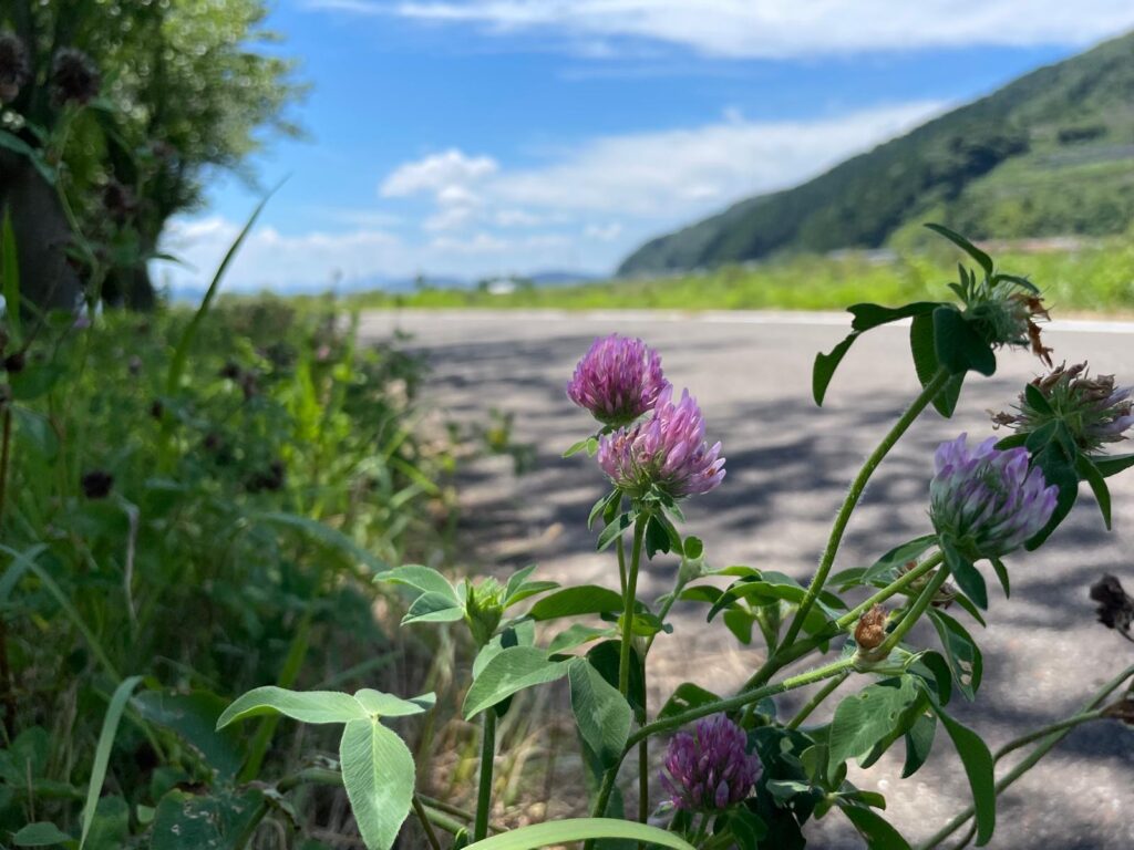 河川敷道路には、シロツメクサの紫色(正式には、ムラサキツメクサ らしい)が元気に生えてました。