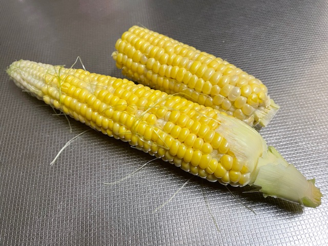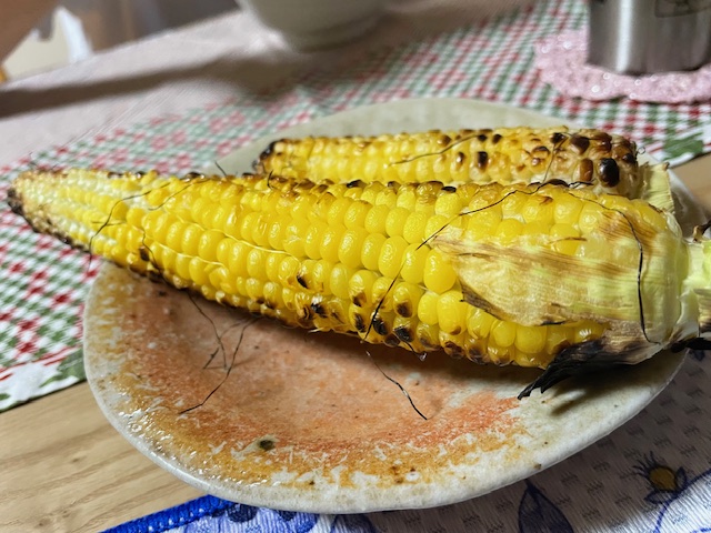 近所で収穫したトウモロコシは、焼いて仕上げました。