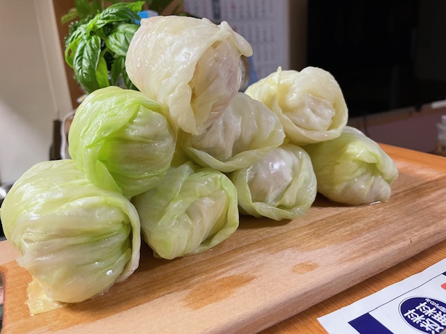 キャベツをめくって1枚1枚湯がいていくから、熱いし…なかなか手間もかかる料理です。