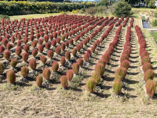 ここ最近の寒暖差で「コキア」もだいぶ色づいてきました。親戚がこの場所のコキアを気にしていたので、