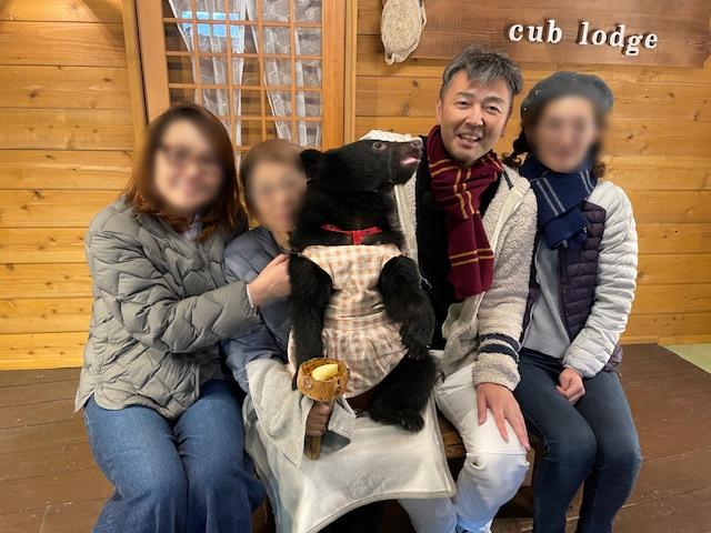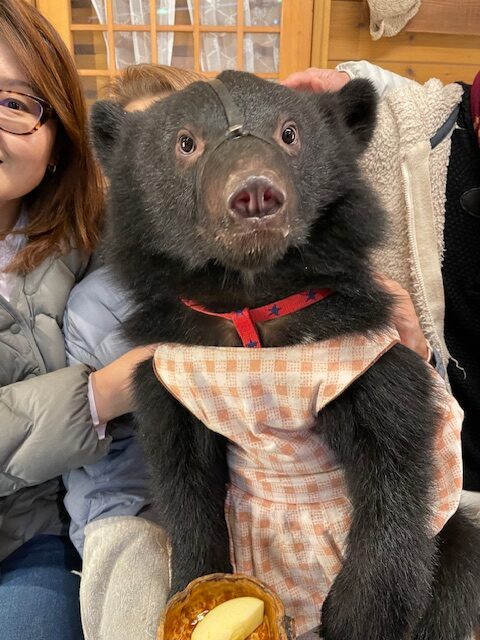 手元にリンゴを置いて、写真撮影をしてくれえます。かわいいのですが、10か月ほど経っている熊なので、うちの柴犬(7k)よりも大きいです。10kはあるかと…