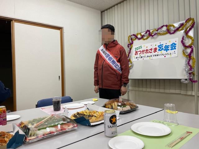 今年のアヤトの忘年会は、社内食堂で行う事になりました。今年の司会進行役「Eさん」のもと開始されました。