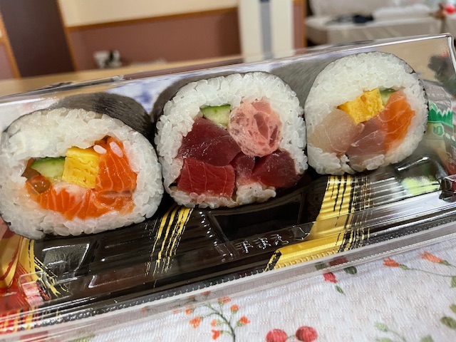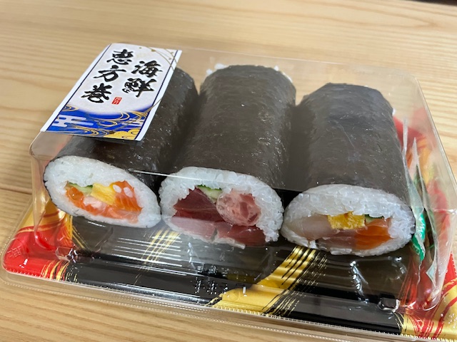 1日早めに今年の恵方巻です。なかなか写真では大きさが伝わりにくいですが、1本の直径が60ミリ(6センチ)ほどあって、サーモン・マグロ・ぶりが、入った恵方巻となります。だんだん豪華になっている気もします。